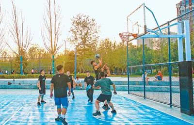 河北省石家庄市长安区拾光智慧体育公园里,市民正在打篮球。这座专业体育公园5月1日开放,以专业的运动设施和优美的健身环境,吸引众多市民前来锻炼。近年来,各地大力新建改建体育场地设施,为全民健身全面开展夯实基础。